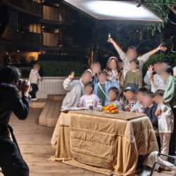 パーティーラウンジに設置されたこたつは、冬の季節感を演出するフォトスポットとして大人気。「子供がコタツを知らなかった」というご家族にとっては、日本の伝統文化を体験し記念撮影できる貴重な機会となりました。みかんや急須が置かれたこたつは、SNS映えする写真スポットとしても機能しました。