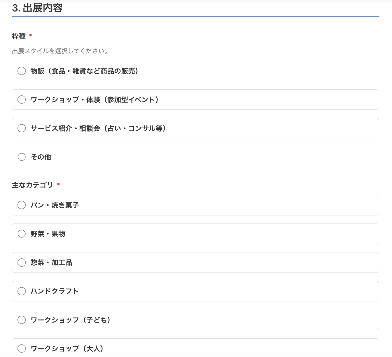 出展料5,500円(税込)のシンプル設計で、地域の農家様が育てた野菜・果物、直産加工品、パン・お菓子、ハンドクラフト雑貨、ワークショップなど、地域で作られたアイテムや体験を提供する事業者様を広く募集します。