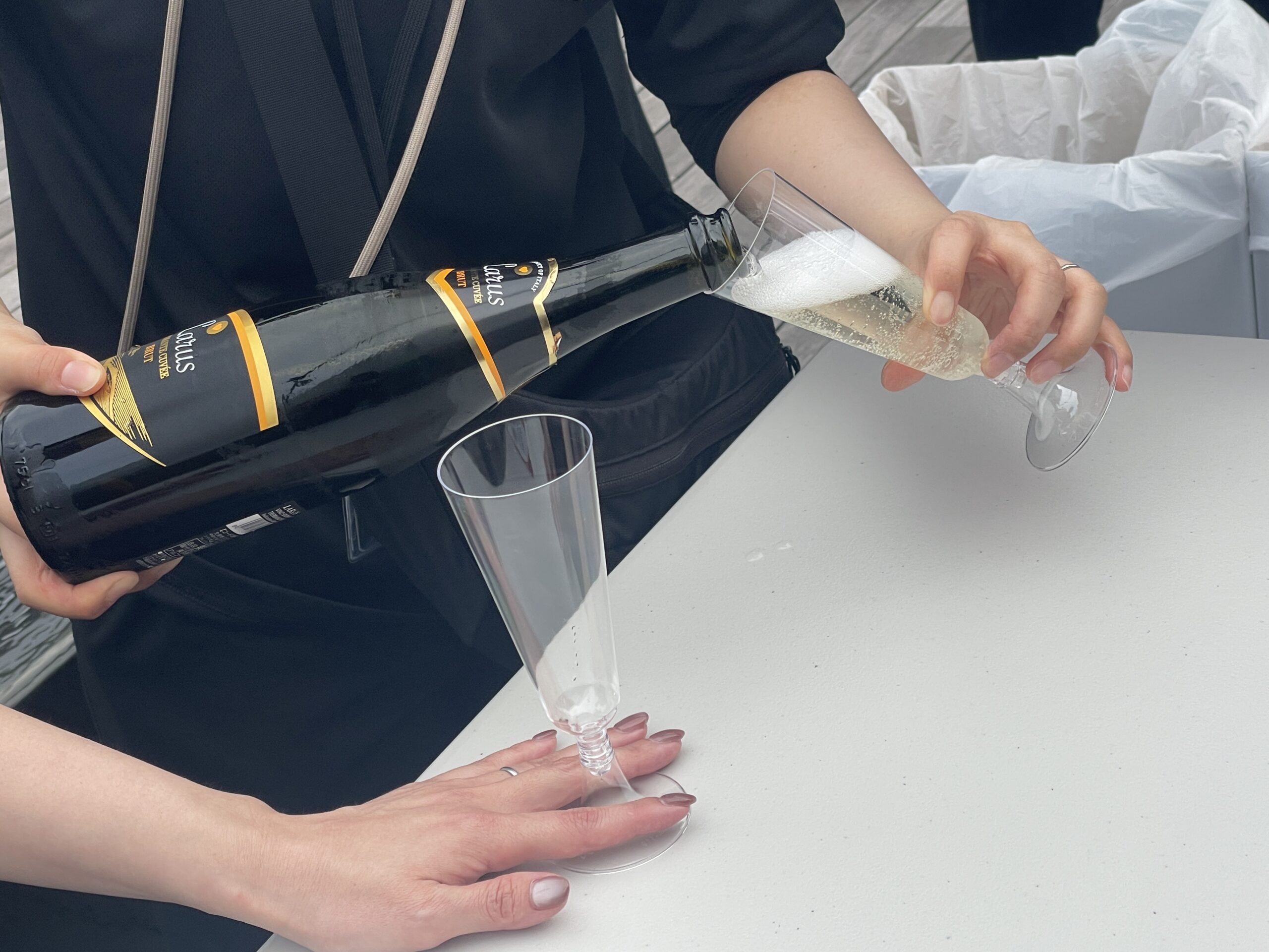 今回は初の試みとして、テラス席での特別なおもてなしを実施しました。丸テーブルには上質なクロスを被せ、椅子にはクッションを配置したことで、まさにラグジュアリーラウンジの雰囲気に!